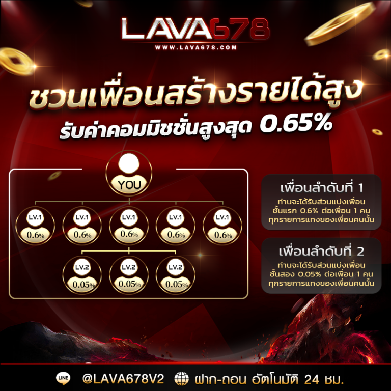 ให้ได้เลือกรับ เมื่อเข้าสู่ระบบในครั้งแรก คุณสามารถกดรับโปรโมชั่นได้เอง และใช้ได้ทันทีไม่ต้องรอเจ้าหน้าที่ดำเนินการ นอกจากนี้ยังมีโปรโมชั่นชวนเพื่อน เล่นพนันออนไลน์ที่ lava1688 เว็บ ตรง เพียงแค่ใส่โค้ดแนะนำเพื่อนเท่านี้ก็ได้สิทธิทั้งลด ทั้งแจกเครดิตจาก เราไปเลย แจกทั้งเพื่อนแจกทั้งคนชวน นี่เป็นเพียงแค่ตัวอย่างโปรโมชั่นและรการคืนกำไรให้สมาชิกเพียงเล็กน้อย เพราะ เรายังมีโปรโมชั่นและกิจกรรมอื่น ๆ อีกมากมายให้สมาชิกได้กดรับรางวัลกัน หากคุณอยากหารายได้ก้อนโตในข้ามคืน สมัครสมาชิกตอนนี้เลยกับเรา อย่าปล่อยให้โอกาสทางการเงินของคุณหล่นหายไป
